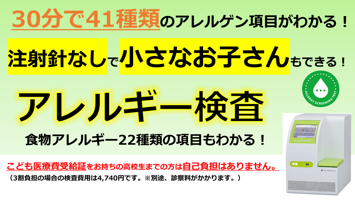 ドロップスクリーン検査とはアレルギー検査のひとつで、41項目のアレルゲンを調べることができます。注射器を使った採血を必要としないことが特徴なので、注射が苦手なお子さんでも負担が少なく安心して検査を実施できます。